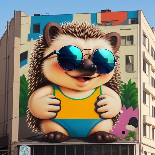 Cute hedgehog with sunglasses depicted as a mural on the side of a building, architecture, graffiti