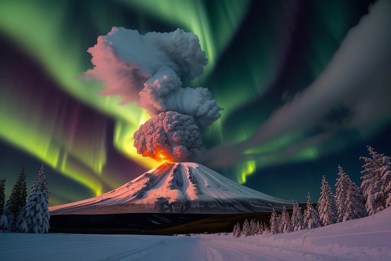 Hyper realistic photo of volcano erupting, in snowy northern landscape, aurora borealis, wide image, two snowy pine trees in the foreground, lightning between the clouds