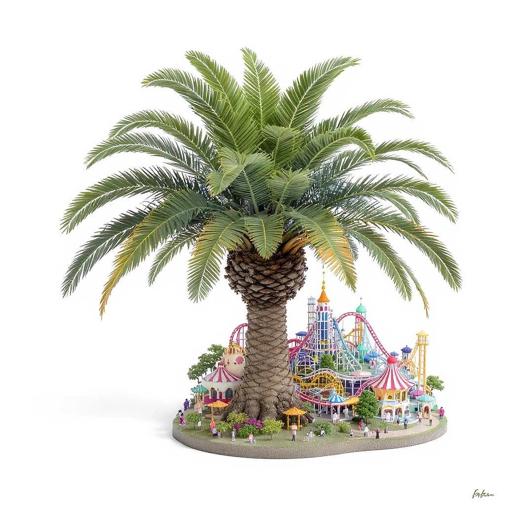 African American palm and I side their palm we see a miniature theme park Great America full of people visiting. The image is isolated on a white background