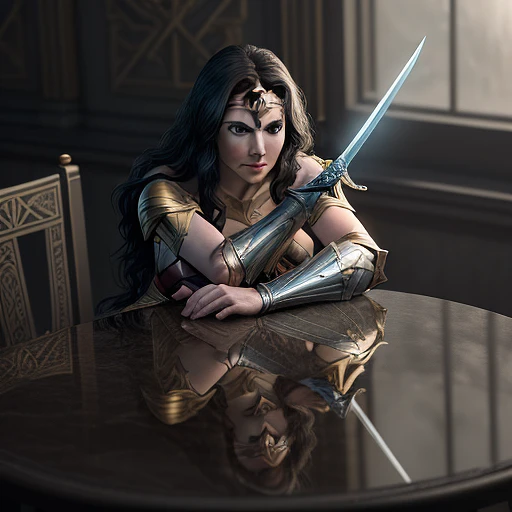 sword on the table with the design and character of wonder woman The sword is gold and grey dark, no watermark, no copyright, high gloss, highly detailed, intricate, green scrollwork, unreal engine 5, octane render, lumen reflections, quixel megascan, 8k, studio lighting, —ar 1080:1920