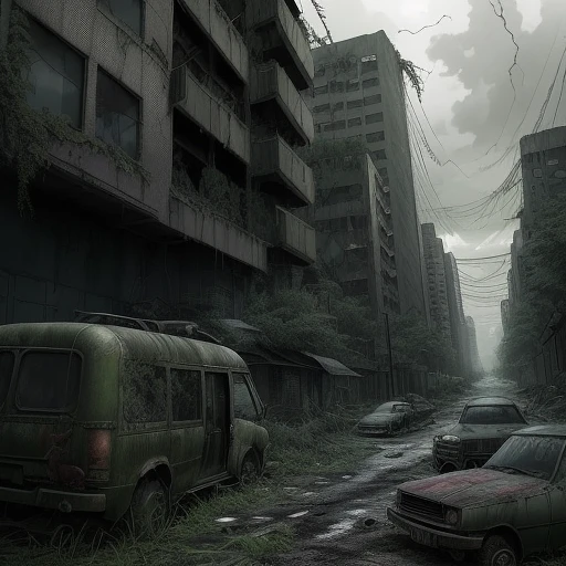 A detailed manga-style illustration of a post-apocalyptic scene inspired by "The Last of Us. " The setting is a city overrun by nature, with lush vegetation creeping over abandoned, rusty cars and crumbling buildings. The color palette should be limited to shades of gray, black, dark blue, purple, and olive green to convey a sense of despair and desolation