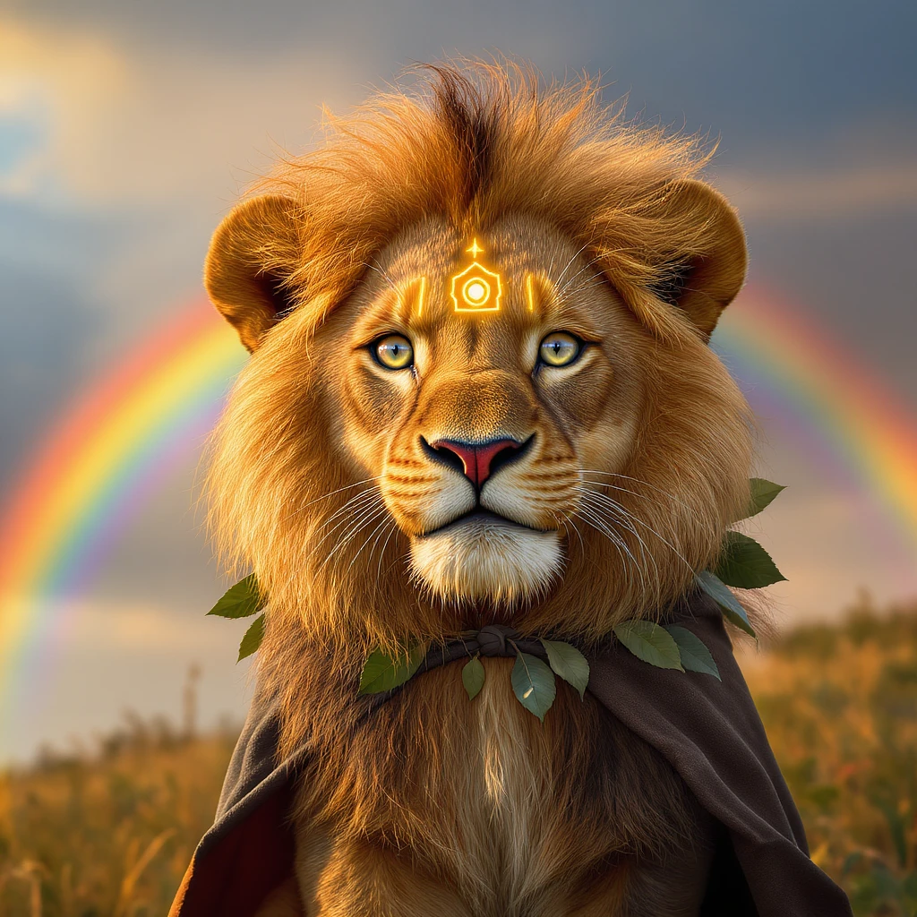 highly detailed realistic image of a Baby lion with the Adinkra symbol glowing on its forehead, wearing a cape made of leaves and smiling under a rainbow sky