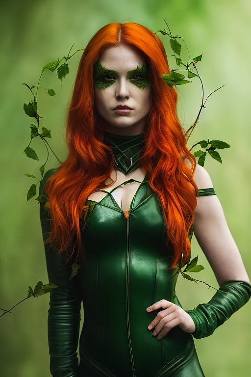 85mm f/1. 4 ISO 200 Color Photo of a beautiful young ginger woman as a villain, tight fitting green leather uniform with dark green accents, in the style of poison ivy, photograph, Atmospheric, cinematic lighting, high contrast, 8k, photorealistic --test --creative --ar 9:16