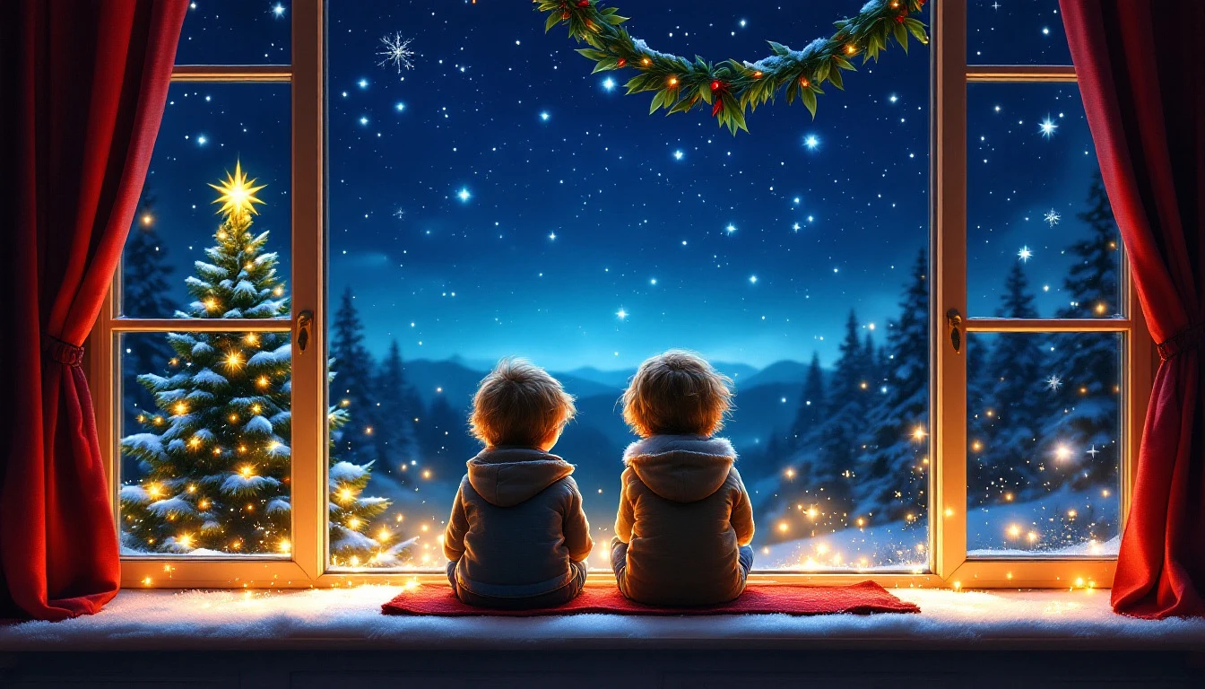 Christmas eve, two children sitting on window sill, starry night sky, magical atmosphere, Christmas tree lights, red curtains, mistletoe hanging, cozy interior, snowflakes, festive mood, anticipation, wonder, photorealistic, warm lighting, holiday spirit, childhood nostalgia