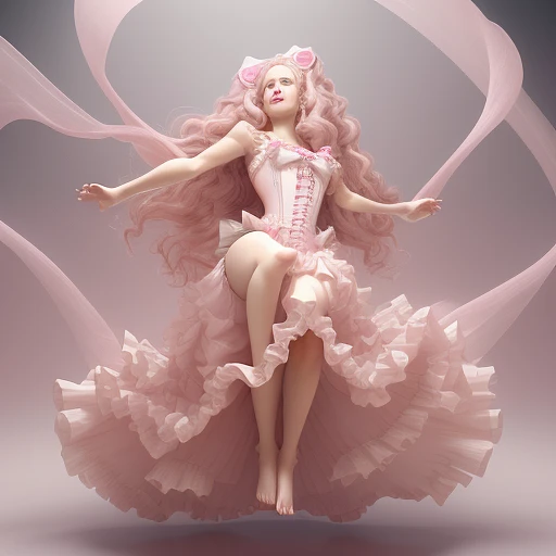 Full body portrait of a white woman with long wavy dark pink hair wearing a long light pink fantasy corset long dress with bows and ribbon, barefoot, hyper detailed facial features rose cheeks, small nose, pink pouty lips, she is floating in midair 8k, 3d, dream like quality full body