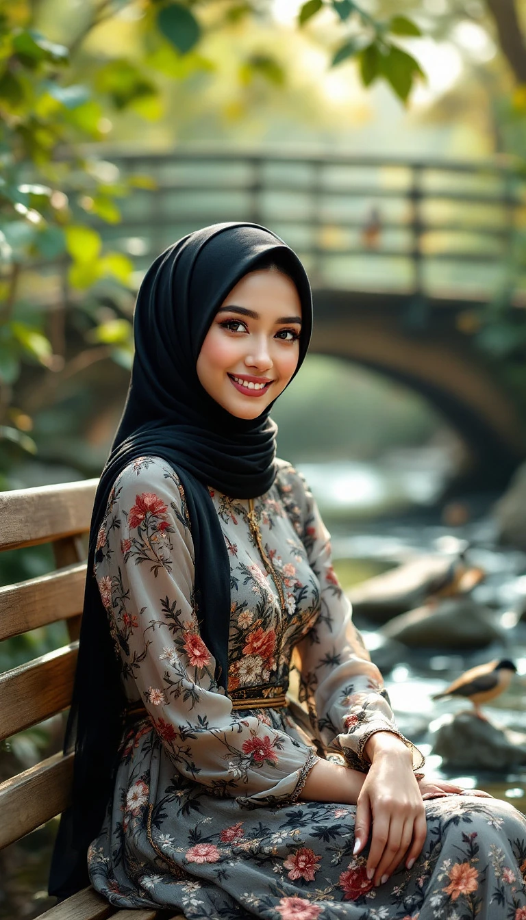 Hyper-realistic, intricate textures, crisp reflections, Cinematic lighting, soft focus background, A highly detailed ultra-HD portrait, close-up zoom-in of a young woman with a warm smile, wearing a black hijab and a long floral dress with intricate embroidery. She is sitting gracefully on a wooden bench near a clear, gently flowing stream with small birds perched on the rocks. Her face is softly illuminated by natural light, showcasing her serene expression. The background of a rustic wooden bridge and lush greenery is blurred, emphasizing her delicate features and the intricate details of her dress. The atmosphere remains peaceful and dreamy, with a warm, golden glow enhancing the scene