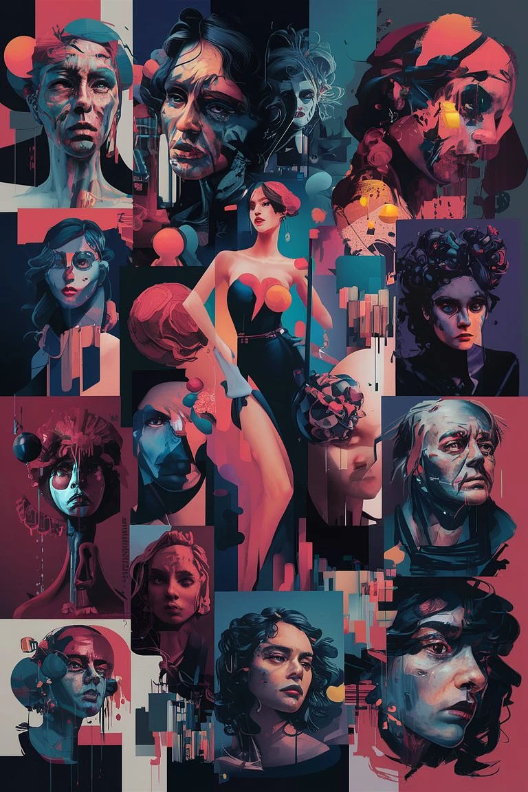 A captivating collection of abstract paintings that delves into the complex connection between color, shape, and emotion. The series showcases a diverse range of brushstrokes and mark-making techniques, resulting in dynamic and emotive forms. The palette is rich and vibrant, with hues that elicit specific moods and sentiments. The thoughtful composition of shapes is crucial, with negative space employed to achieve equilibrium and harmony. The artwork is reminiscent of a fashion-forward, dark fantasy world, with a cinematic and typographic flair. The 3D render and portrait photography elements add depth to the composition, while the graffiti-like style gives it a modern, urban edge. , product, poster, dark fantasy, fashion, graffiti, 3d render, painting, cinematic, conceptual art, vibrant, typography, portrait photography