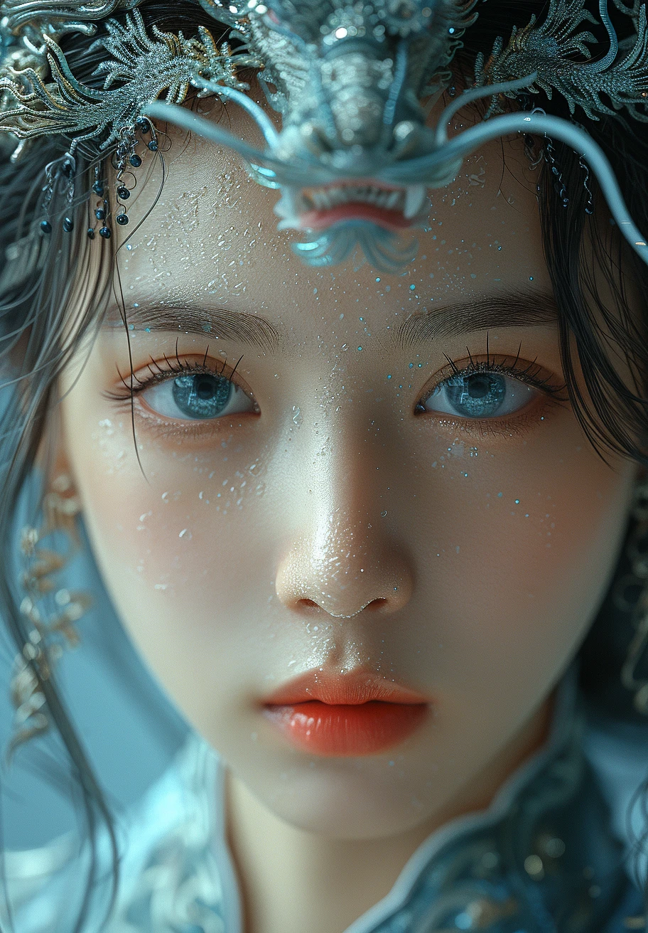 an illustration of a chinese girl with blue eyes and an oriental dragon, in the style of realistic marine paintings, dark romantic, i can't believe how beautiful this is, elegant, emotive faces, soft, dreamy scenes, graceful lines, gongbi --ar 72:103 --stylize 750 --v 6