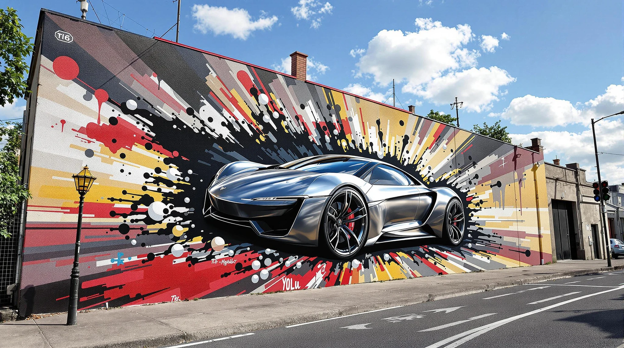 a close up Image showcases a painting on a building , featuring a 3D graphiti art scenery depicting a sports concept car, with a modern art design. The car is emerging from the wall, blending seamlessly with the surrounding urbain environment. The car's sleek, metallic body and glossy black accents seem to merge with the wall's texture, creating a stunning visual effect. The wall's colors and patterns subtly reflect the car's aerodynamic design, adding to the illusion of emergence. The surrounding environment, with urbain structures provides a serene backdrop, while the clear sky with scattered clouds hints at a bright, sunny day.