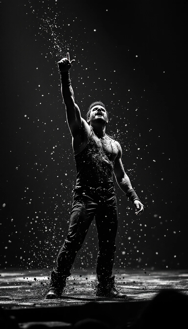 an-image-of-freddie-mercury-on-stage-raising-one-arm-highly-detailed-ink-splatter-image-grunge-s-, ultra realistic 8k cg, dark background, high contrast