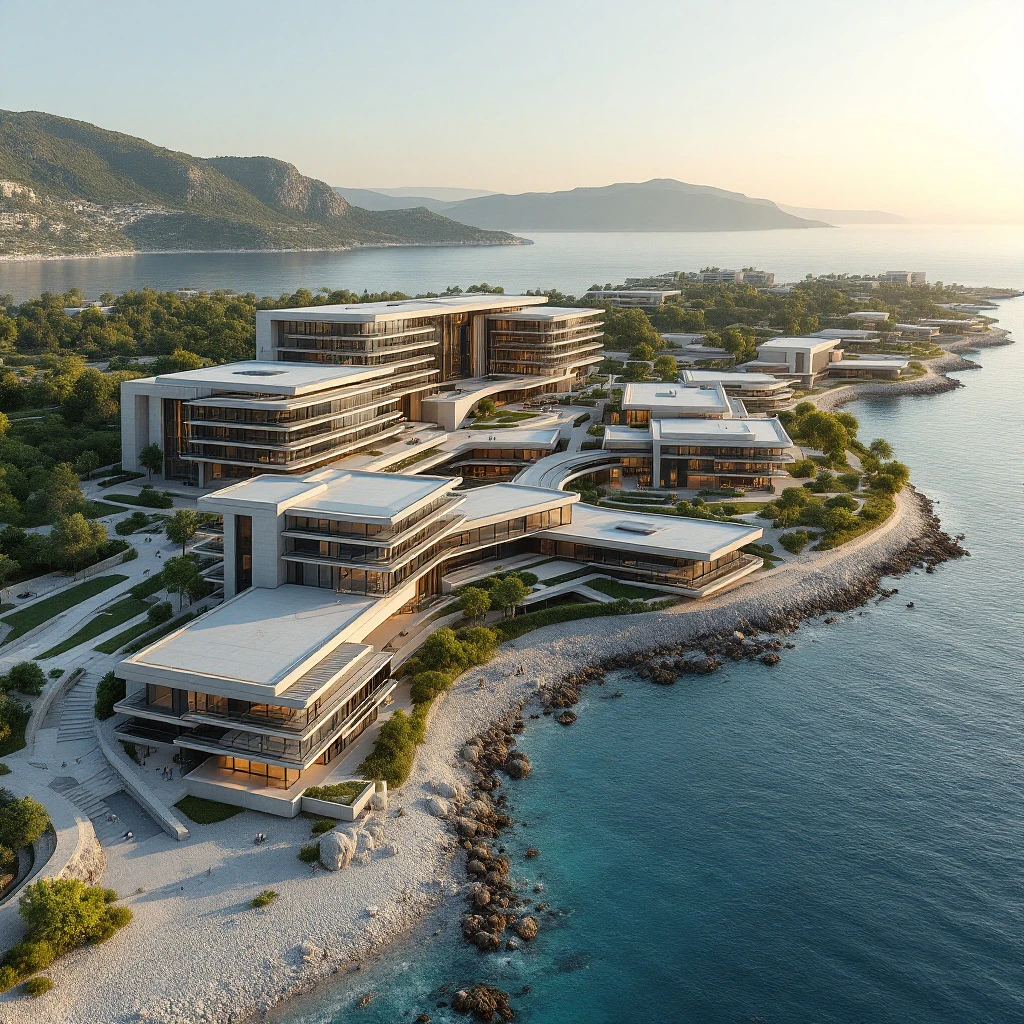 Ultra-realistic aerial cinematic view of Crimean coastline, focusing on modern luxury hotel complex. Minimalist architectural design with clean, geometric lines and flat white/gray roofs. Sleek contemporary buildings with glass facades, seamlessly integrated into coastal landscape. Pristine waterfront with architectural precision, minimal landscape intervention. Scandinavian and Japanese minimalist design influence. Sharp architectural lines, maximum transparency, neutral color palette - whites, grays, soft concrete tones. Modern infrastructure, subtle architectural bridges connecting buildings. Golden hour lighting with soft shadows, creating depth and sophistication. Hyper-detailed urban planning, 8K resolution, photorealistic architectural photography style. Emphasis on clean design, negative space, and architectural elegance. No traditional mountains, focus on smooth coastal terrain and cutting-edge architectural solutions.