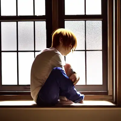 anime boy sitting in room near window , moon , a girl playing with cat in rain