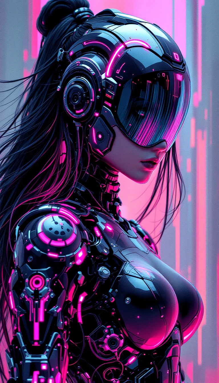 vibrant reflective holographic drawing in the style of ckhg, female cyberpunk robot samurai, robot face with mirrored face shield, hyperdetailed helmet, flowing black hair, reflective black and neon red SilverPulse armor, robot joints, body made of metals, cables and wires, a katana strapped to her back, abstract background suggesting eastern temple