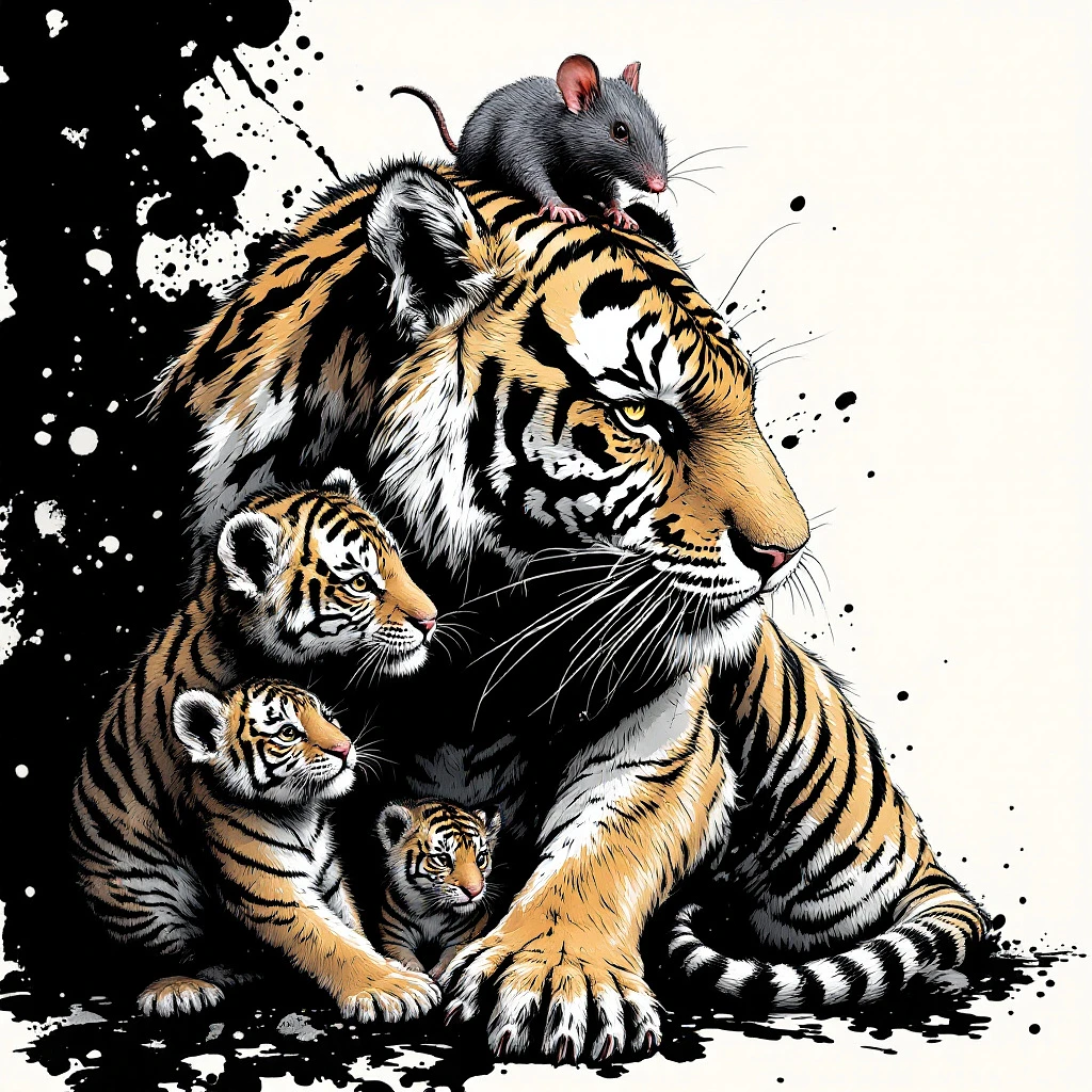 a tiger and two tiger cubs, and a oversized mouse, ferocious, detailed, full-body shots, ink style, Ink splash art on the background, ink style, The whole is on the right,Ink wraps around the body, and the ink obscures the subject, The rat sits on the head of the subject