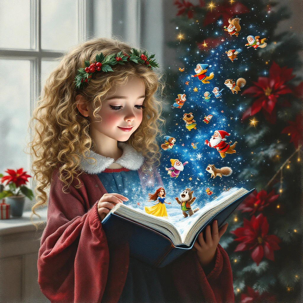 A charcoal and pastel drawing of a 10-year-old girl with curly blonde hair. She is wearing a Christmas dress and a headband with holly and red berries. She holds a half-open book in her hands, the pages of which turn into a bright winter landscape. Out of the book emerges, Disney Pixar style, Snow White, dwarves, a squirrel, and a raccoon, surrounded by other small Christmas figures that are also flying. The girl is looking into the book. In the background is a whitewashed window with a poinsettia. Nearby is a Christmas tree with lights.