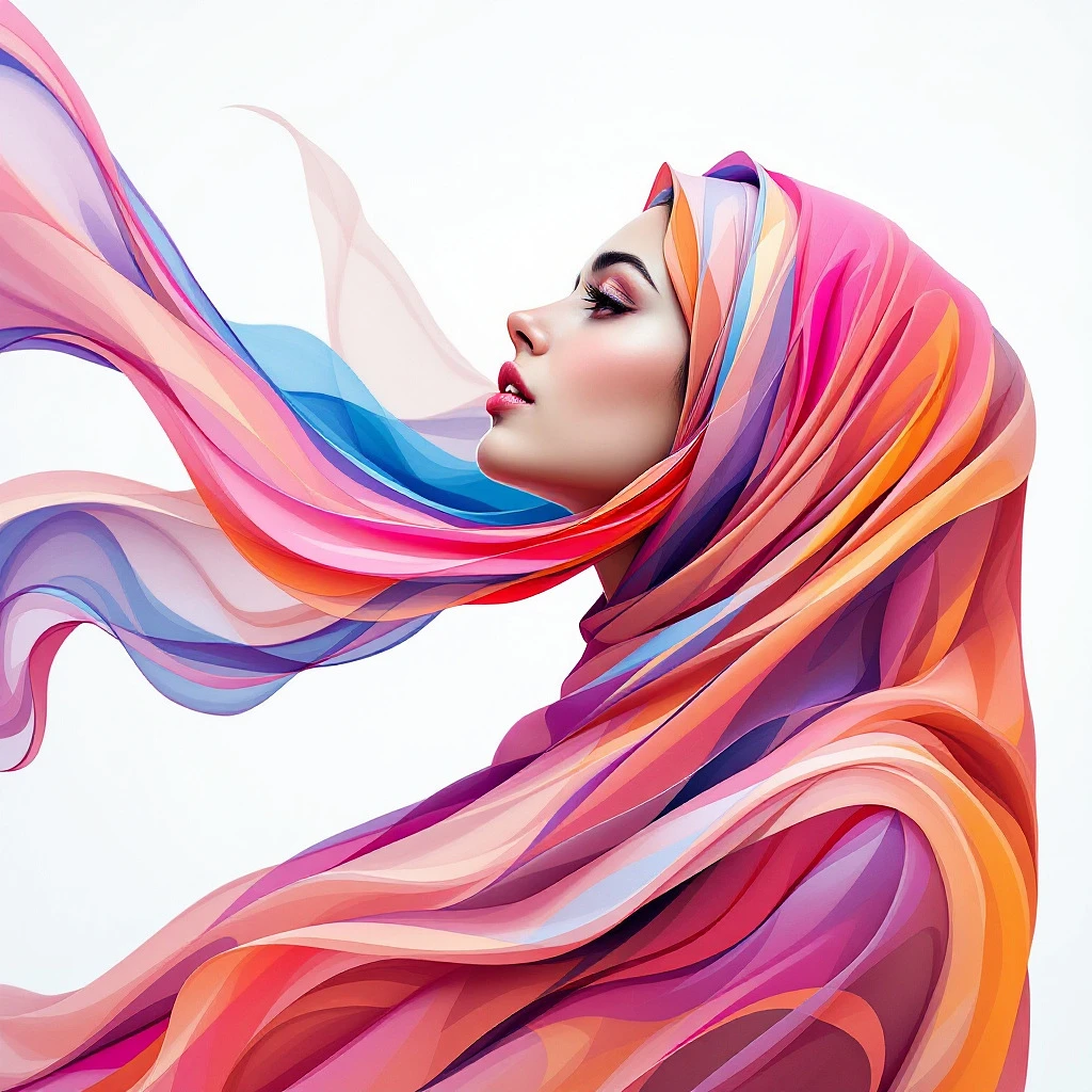 a beautiful Iranian woman, wearing scarf flowing in wind, no color in face, looking horizon, painting by Lois van Baarle and Greg Rutkowski, Artgerm, beautiful colors, abstract shapes, soft lines, elegant curves, white background, high resolution, surreal, fantasy, geometric abstraction