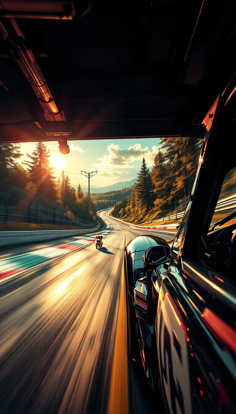 Summer. The first racing car racing on the track. From the car window, far around the bend, you can see a small Puppy running out onto the highway. The camera looks from behind the car. The race track is well lit by the sun. Style - cyberpunk