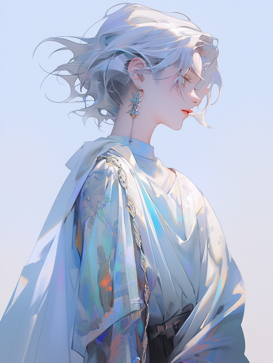 Midjourney prompt: shorthaired anime girl, wearing flowing fabric shi...