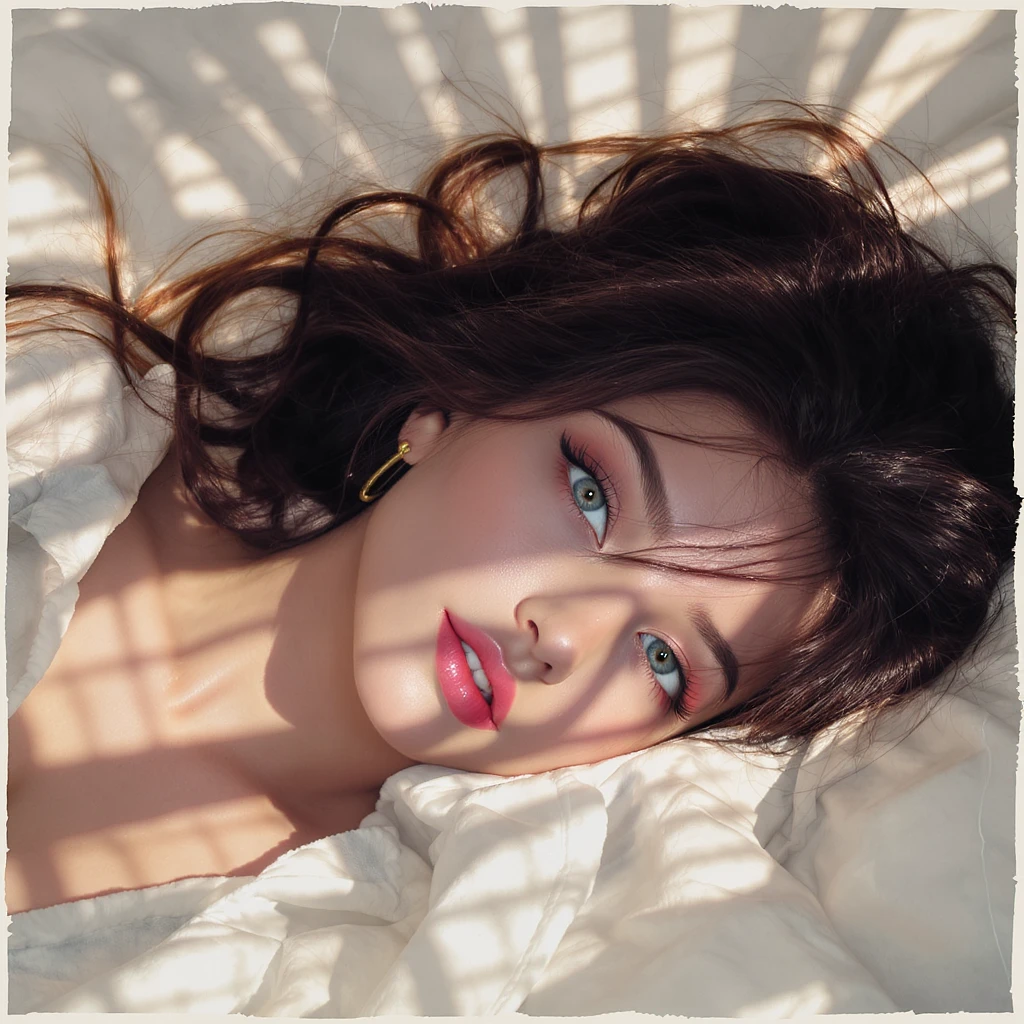 an attractive young woman with blue eyes lying face down on the bed, in the style of animated gifs, light white and light amber, jagged edges, the snapshot aesthetic, timeless beauty, goosepunk, sunrays shine upon it --no freckles --chaos 65 --ar 1:2 --profile yruxpc2 --stylize 750 --v 6. 1