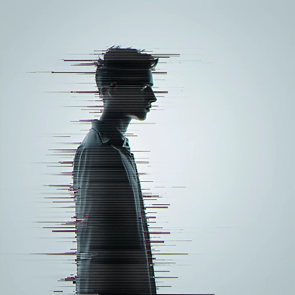 glitch art with linear distortion, horizontal scan lines and digital interference, vertical portrait of single human silhouette, minimal grey background, horizontally distorted figure with scan line interference pattern, soft diffused lighting, corrupted data aesthetic with noise texture and horizontal artifacts --ar 9:16 --quality 2 --style raw --profile ue2yzjl --stylize 300 --v 6. 1