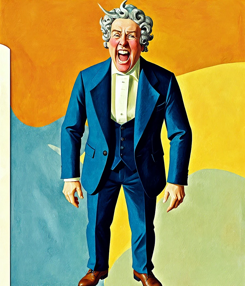 a portait of the man in the wig laughing hard, single color background, full body, margin around the body
