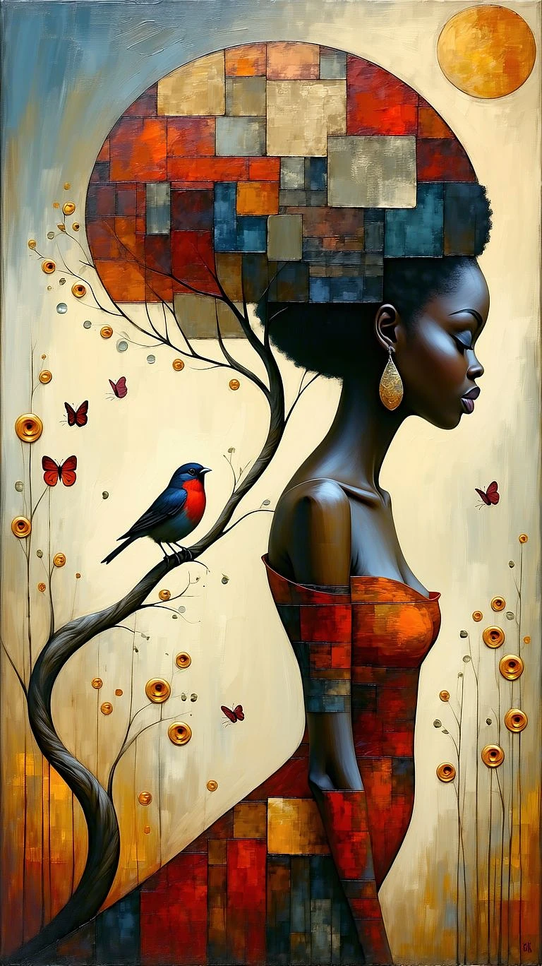 art-by-catrin-welz-black-woman--stein-susan-a-black-woman-with-her-cute-adorable-love-birds-tree-muted-colors-surrealism, baroque pop, symmetrical composition, Mark Ryden and Romare Bearden style