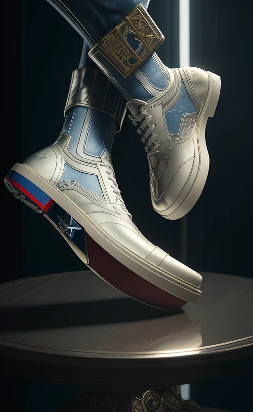 Shoes on the table with the design and character of captain america The Shoes is gold and white dark, no watermark, no copyright, high gloss, highly detailed, intricate, silver scrollwork, unreal engine 5, octane render, lumen reflections, quixel megascan, 8k, studio lighting, —ar 1080:1920