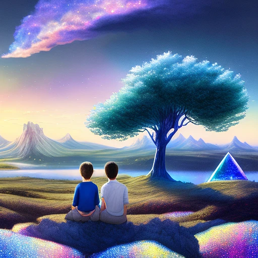 Boy and girl looking at the horizon sitting on the epic tree in the background. Beautiful prismatic-plasma lake blue crystal, mounteins epic, digital painting, extreme detail, 4k, ultra hd, hyper detailed, colorful, sparkle covered sky, masterpiece 3D science fiction art. Bright blue skys, clouds brigth white. sun white brigth. day. Sun.