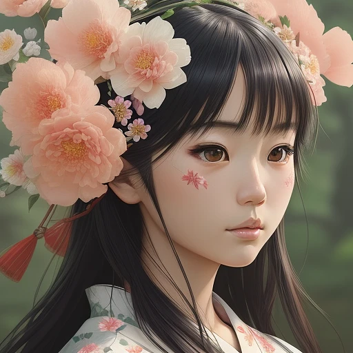 picture of a beautiful Japanese girl dressed in flowers, in the style of artgerm, loose linework, lush and detailed, detailed facial features, cottagecore, nature-inspired, close-up intensity --ar 74:95 --stylize 750 --niji 6