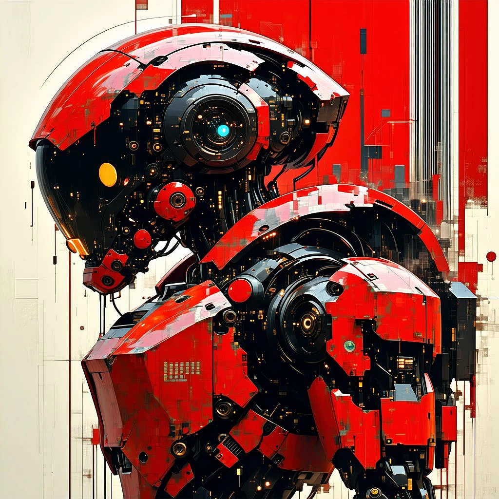 Hyper realistic, mecha, dmagaed rednn and black armor, propaganda barcodes, dystopian era, raw style, photo quality