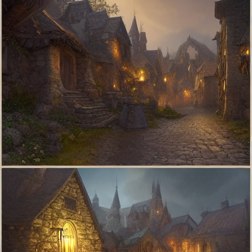 """a beautiful dark fantasy medieval large village with several houses made of stones in a beautiful landscape""8k resolution concept art by Greg Rutkowski dynamic lighting hyperdetailed intricately detailed Splash art Midjourney accuracy trending on Artstation triadic colors Unreal Engine 5 volumetric lighting Alphonse Mucha WLOP Jordan Grimmer, complementary colors"