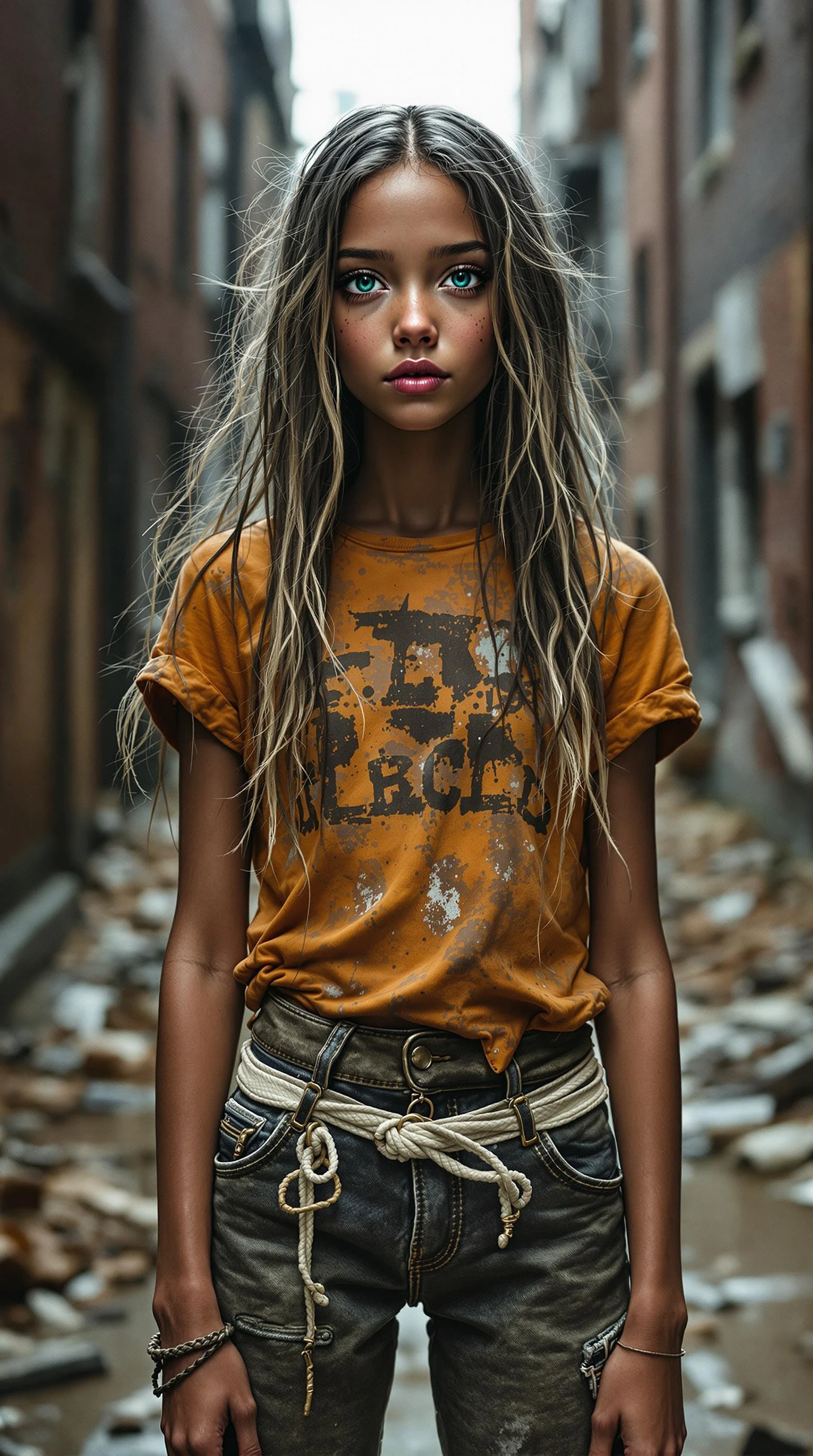a professional photo of a exceptionally of the most beautiful American girl (age 11) in 1960's Chicago, (futuristic) , (masterpiece) , (realistic) , (perfect anatomy) , (viewing from head to knees) with extremely long black blonde hair, large beautiful brilliant Forest Tea red-green-blue-silver-brown-golden-grey eyes, flawless olive skin, (dressed in dirty ragged t-shirt and jeans,1960's Chicago slums) standing between run down Chicago project buildings. 8k, (high res) , ultra-detailed, photo-realistic, full image view, full body view, front view, highly detailed, volumetric, dramatic lighting