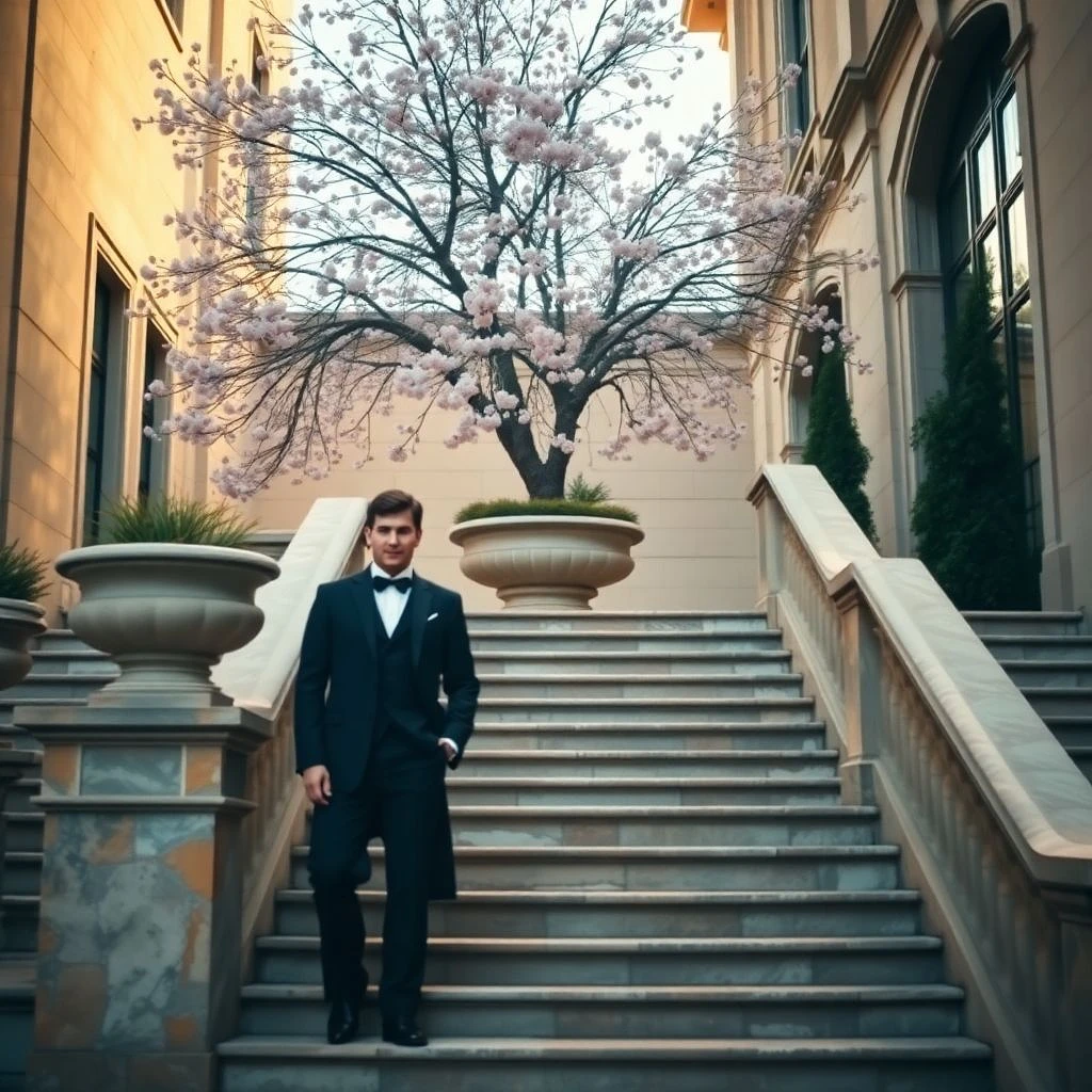 In the background, a large stone planter box is visible, containing a flowering tree with delicate pink blossoms. The tree's branches stretch upward, toward the top of the staircase, adding a touch of natural beauty to the scene. The overall lighting in the image is soft and diffused, with a warm, golden glow that suggests a late afternoon or early evening setting. The camera perspective is wide-angle, capturing the full sweep of the staircase and the surrounding architecture. The style of the image is reminiscent of classic Victorian-era portraiture, with its emphasis on formal, elegant attire and stately, dignified poses. The camera used to capture this image is likely a high-end digital SLR with a wide-angle lens, allowing for a broad field of view and a high level of detail.