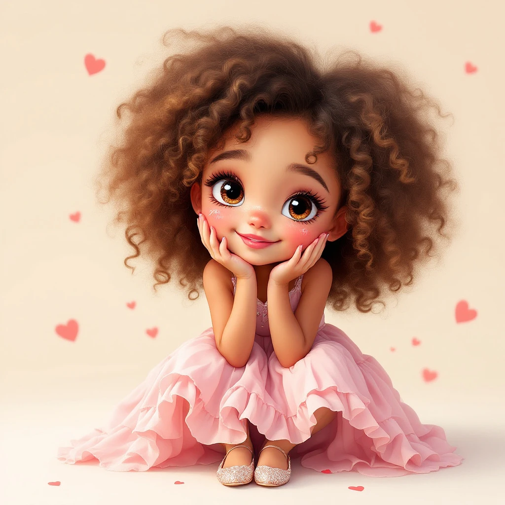 Cute girl (ethnicity:1.2) , (age:1.1) , with voluminous, curly, light brown hair, (detailed hair:1.2) , in a light pink, tiered, puffy dress (detailed clothing:1.2) , (detailed fabric:1.2) with delicate ruffles, (accessories:1.1) wearing sparkly high heels (detailed shoes:1.2) . She has large, expressive eyes (facial features:1.3) with a gentle, smiling expression (expression:1.2) , posed with her hands resting gently on her cheeks, a calm, relaxed pose (pose:1.2) , and a soft, airy atmosphere. The girl is positioned in the center of the image, facing the viewer (orientation) . The lighting is soft and diffused, creating a gentle glow on her face and dress (lighting:1.2) . The background is a plain light beige or cream color (color palette:1.1) , with small red hearts subtly scattered around. The style is illustrative, with a vibrant color palette, high definition and detailed rendering (style:1.2) , (detailed skin texture:1.2) , illustrative art style, digital art.