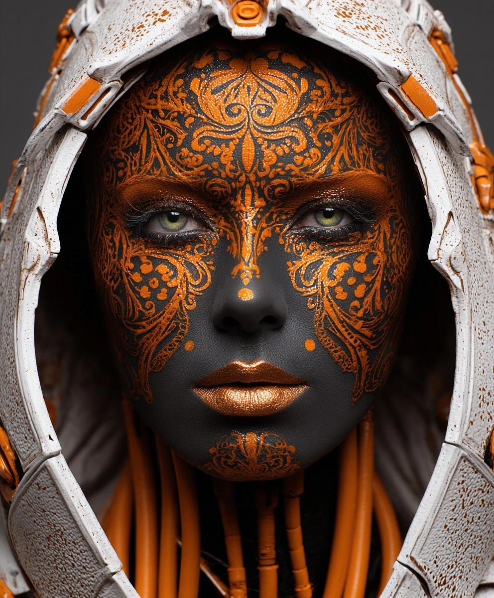 close-up fashion portrait of an enigmatic woman, her face is totally painted with matte jet-black makeup. She is strictly facing the camera in a passport-style photo, direct gaze, both eyes level. Her face is adorned with intricate, symmetrical, vibrant orange bioluminescent filigree 3D in relief patterns in a baroque style. She wears a sculpted, biomechanical hood made of a bone-white material. Piercing hazel green eyes, metallic pewter lips. Bright orange cybernetic cables. Professional studio lighting --no head turn, 3/4 view, profile, grey skin, blue skin --ar 5:6 --raw