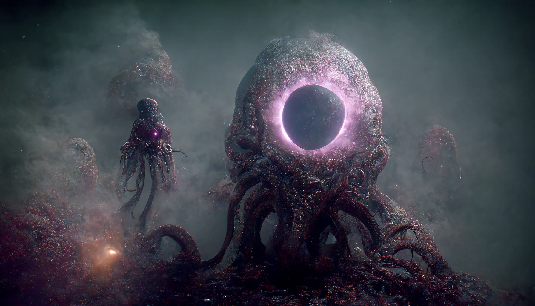 Cosmic horror, Eldritch horror, Sauron, dnd illithid, giant octopus, space, eclipse, distant stars, dark fantasy, ultra-detailed, surreal, discernable figures, Lovecraftian horror, mists, fog, Unreal Engine, 4k, dramatic lighting, post-production, subtle violet lighting, octane render --q 2 --ar 16:9