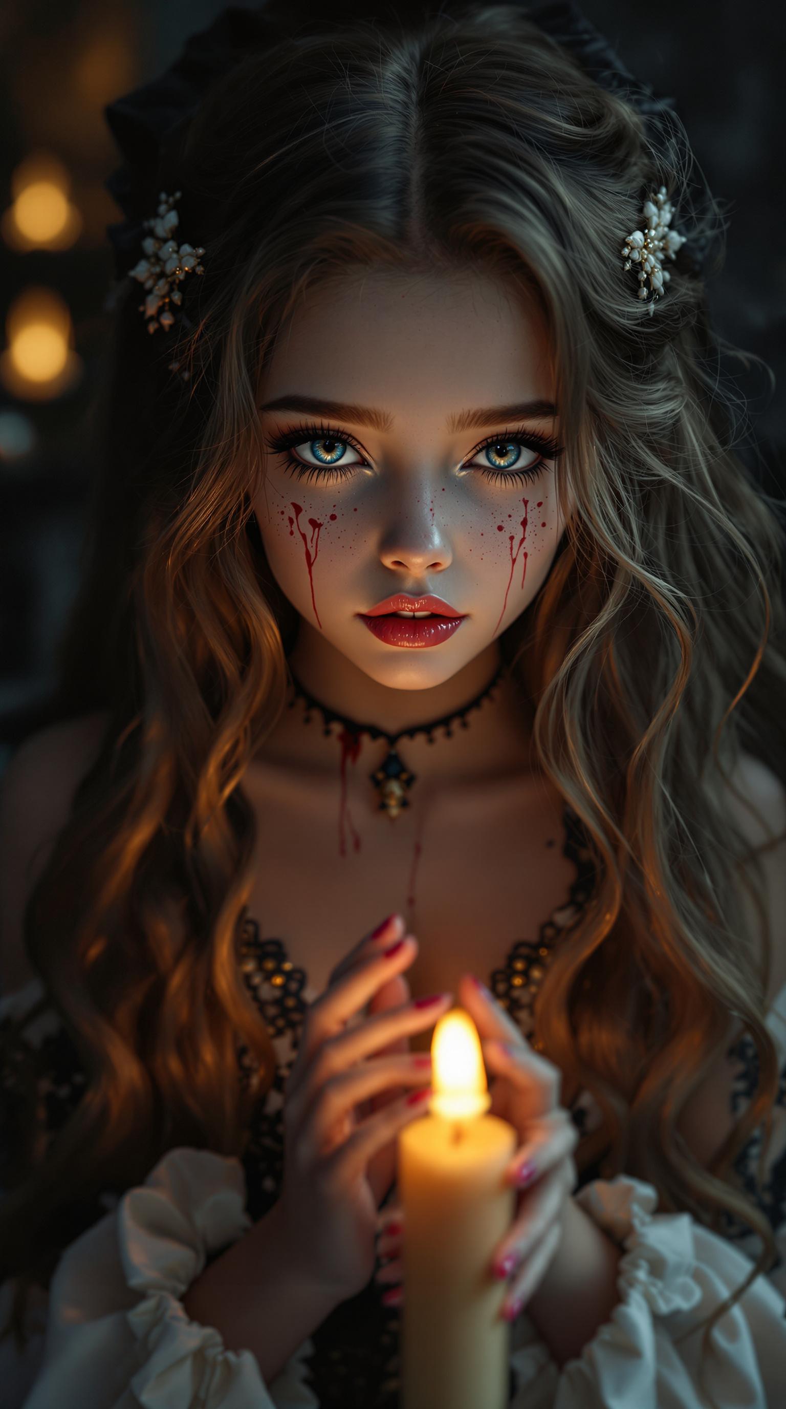 a professional photo of a most beautiful 3rd grade girl in the world, vampire, in a highly detailed, futuristic, masterpiece, realistic, Full body, facing the viewer, with extremely long light brown hair, beautifully flawless olive skin, thick black eye liner, blue eye shadow, extra long eye lashes, light pink blush, extremely beautifully shaped lips with light pink lipstick, blue eye shadow, perfectly flawless olive skin, beautiful perfect high cheekbones extremely detailed perfectly shaped beautiful brilliant bedroom Forest Tea blue-golden-grey eyes, beautifully manicured fingernail with pink polish, dressed in the style of Horror of Dracula on the 1958 movie set wearing a fragile elegant nightgown sitting up in her coffin, upper fangs over lapping her lower lip, with a small trail of blood trailing down form the comer of her mouth, in a candle lit old family crypt, high depth of field, created with Unreal Engine 5 and Octane Render, high resolution photography, intricate details, ultra-sharp focus. --v 6.1 best quality, 8k,high res, masterpiece:1.2, ultra-detailed, realistic, photo realistic, photo-realistic:1.37, high res, ultra-detailed, photo-realistic, front view, highly detailed, volumetric, dramatic light Perfect graphics, ultra-detailed, photo-realistic, full image view, full body view, front view.