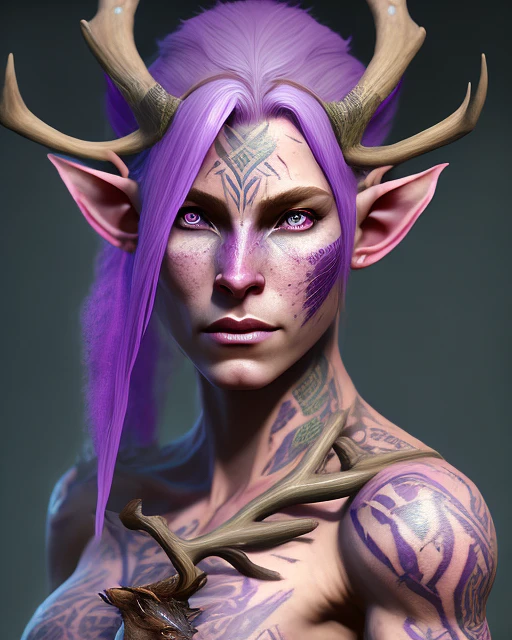 portrait painting of an angry elven eladrin young woman warrior with short light purple hair and freckles and tribal tattoos on her cheekbones and deer antlers on forehead, body builder, foliage armor, ultra realistic, concept art, intricate details, eerie, highly detailed, photorealistic, octane render, 8 k, unreal engine. art by artgerm and greg rutkowski and charlie bowater and magali villeneuve and alphonse mucha
