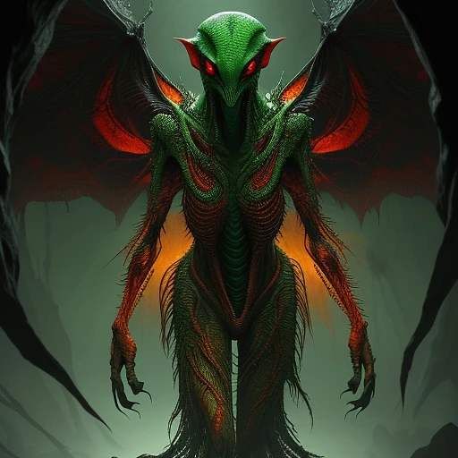 Full body photo of a scary alien creature that looks like a bird from a cave, green deadly red eyes, horror, golden skin, intricate design and details, dramatic lighting, photorealistic, cinematic