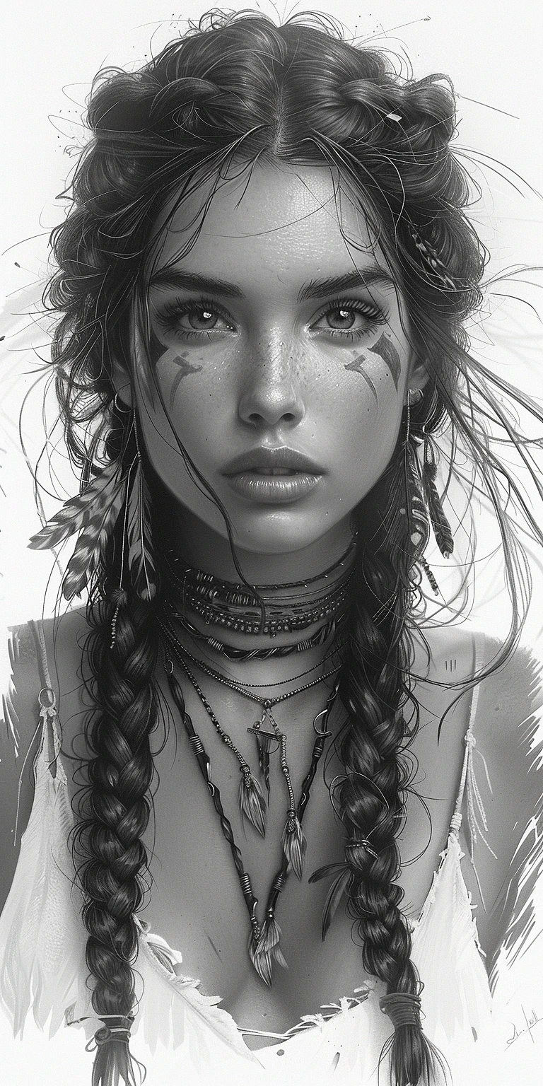a black and white pencil drawing of an attractive woman with braided hair, warrior goddess, feathers in her long hair, tribal tattoos on her face, white background, high contrast, hyper-realistic, cinematic lighting, pencil sketch style, artstation --ar 1:2 --stylize 750