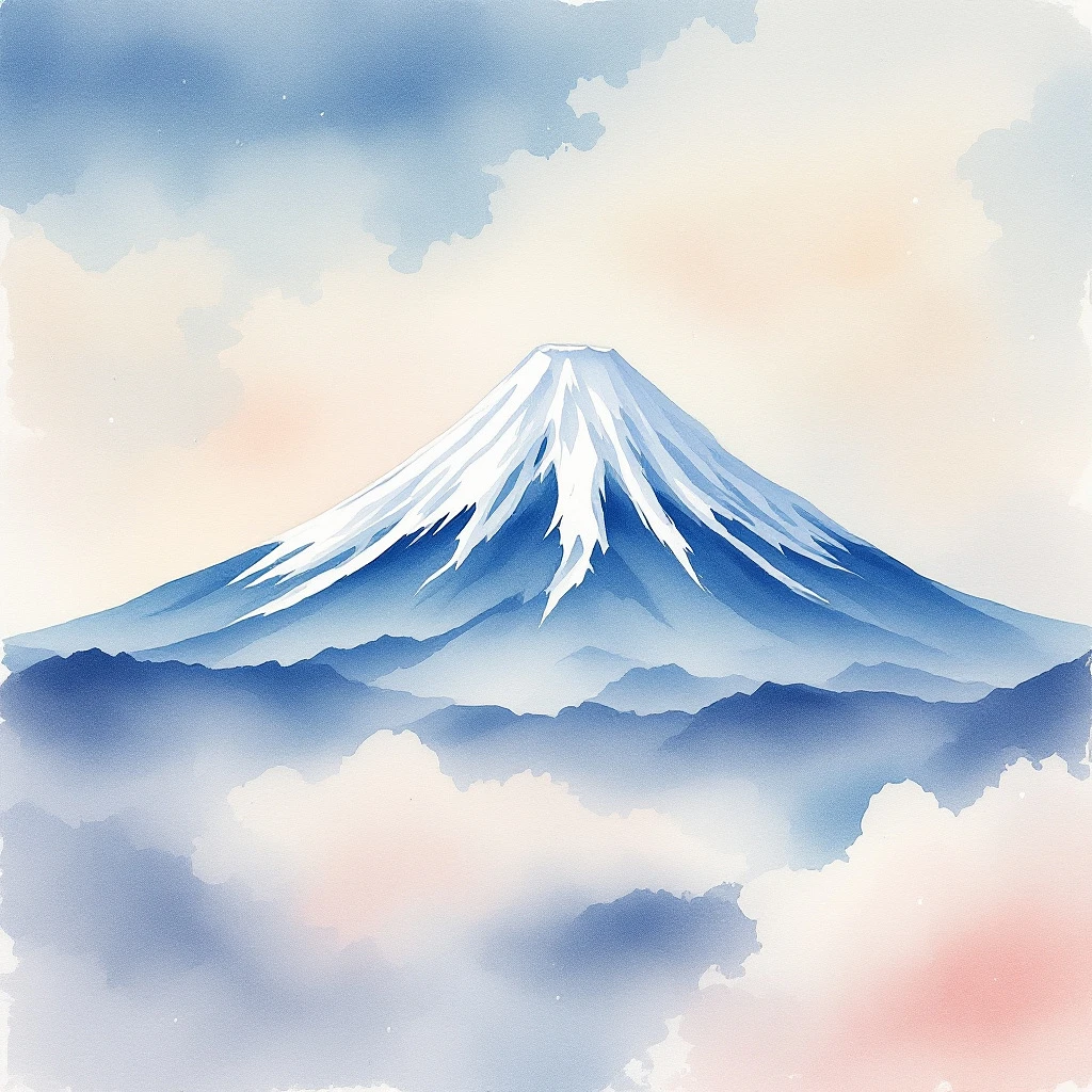 Whimsical Mount Fuji rendered in an Ethereal Watercolor Dreamscape, with soft, fluid brushstrokes and translucent layers of color. Emphasize a dreamy atmosphere with a color scheme focused on whites and blues of varying hues and --ar 3:2
