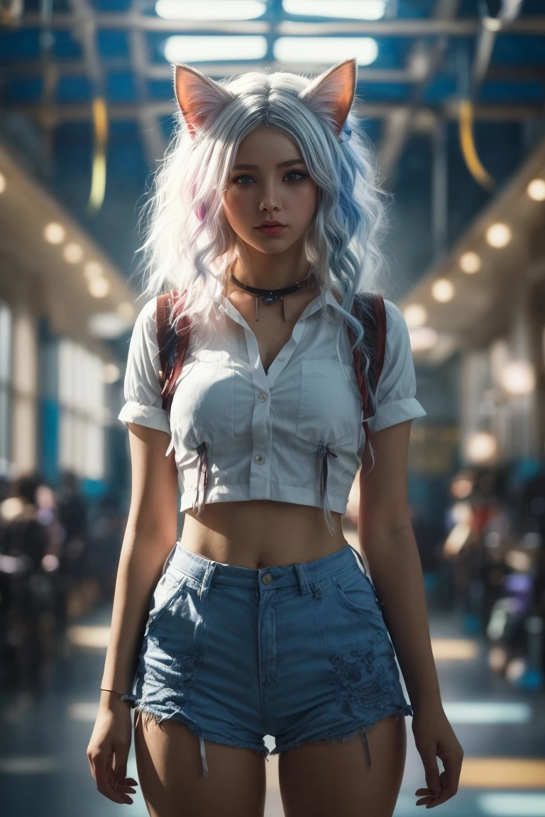 Solo, anime , cat ears, full body, adult body, large chest, Hyperdetailed school background, School, shorts, Detailed medium white hair braid, hair braid, Cat ears, beautiful, Detailed eyes, blue eyes, front view, torso shot from waist, Thick lineart, Anxious, Hyperdetailed natural light, detailed reflection light, volumetric lighting maximalist photo illustration 64k, resolution high res intricately detailed complex, key visual, precise lineart, vibrant, panoramic, cinematic, masterfully crafted, 64k resolution, beautiful, stunning, ultra detailed, expressive, hypermaximalist, colorful, rich deep color, vintage show promotional poster, glamour, anime art, fantasy art, brush strokes, , 16k, UHD, HDR, (Masterpiece:1.5) , Absurdres, (best quality:1.5) , Anime style photo, Manga style, Digital art, glow effects, Hand drawn, render, octane render, cinema 4d, blender, dark, atmospheric 4k ultra detailed, cinematic sensual, Sharp focus, hyperrealistic, big depth of field, Masterpiece, colors,