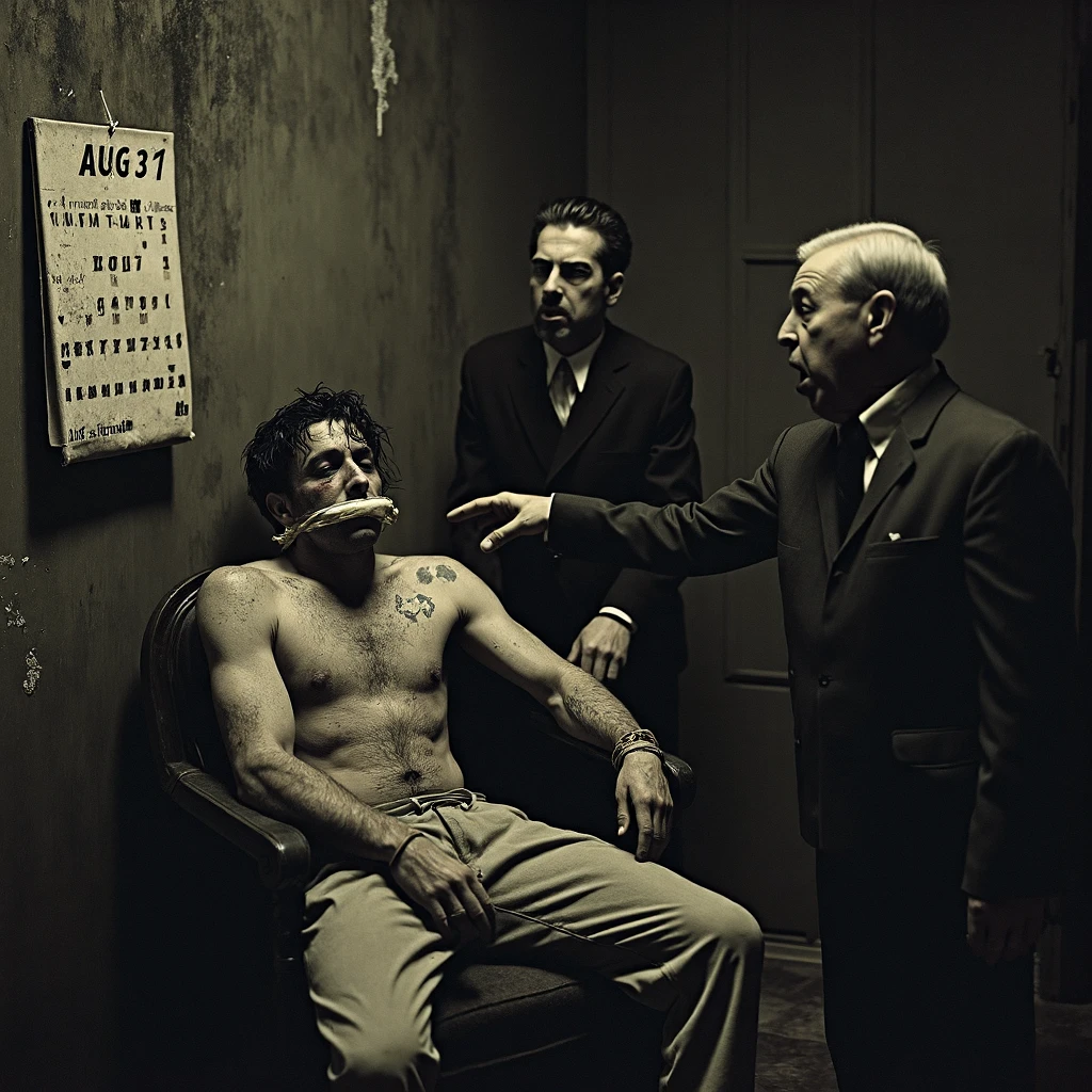 analog noisy photo inside a semi-dark dusty room with a calendar on the wall that says ("AUG 31") , a man with his hands tied to a chair and a gag in his mouth, his hair is disheveled and there are marks of beatings and bruises on his face, next to him are two angry Italian mafiosi, one of the men points to the calendar hanging on the wall and shouts towards the man so loudly