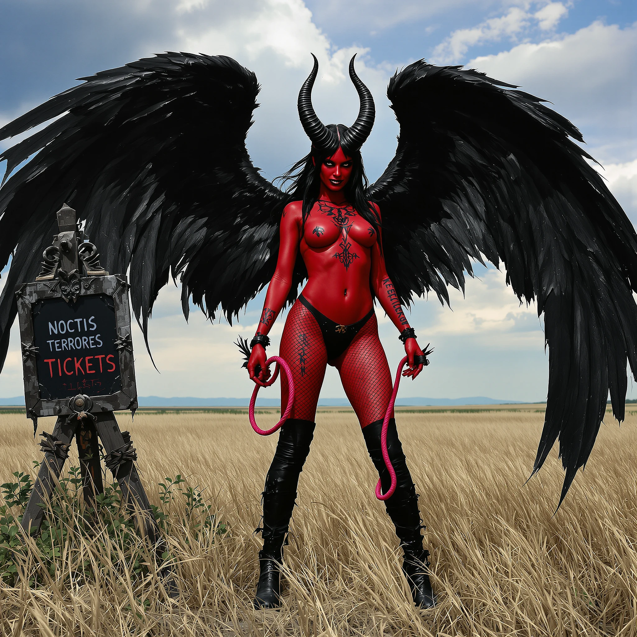 Fullbody view bold composition, in a bold posing, fantasy art, wide angle: From a distance, A bossy adittude powerful red skined female demon looking straight in the lens, reminiscent of Beksiński's dark mysticism. Black wings. Her serene face shows a hint of a bold smile, reflecting a determined yet confused expression. Her long dark hair frames her face like a quiet halo. Curved obsidian horns with intricate runes. A simple gothic necklace and a smal tattoo with "NOCTIS TERRORES" on her left chest. She's wearing She wear black overknee Latex boots with itricate detail and fishnet pantyhose, latex lingerie and a pink whip, She exudes an aura of quiet passion an strength. The lighting is dramatic, with deep shadows and soft, ethereal highlights. She stands in a open field like a queen of the night. with a sign with "Noctis Terrores' tickets"on the left. nice summer noon