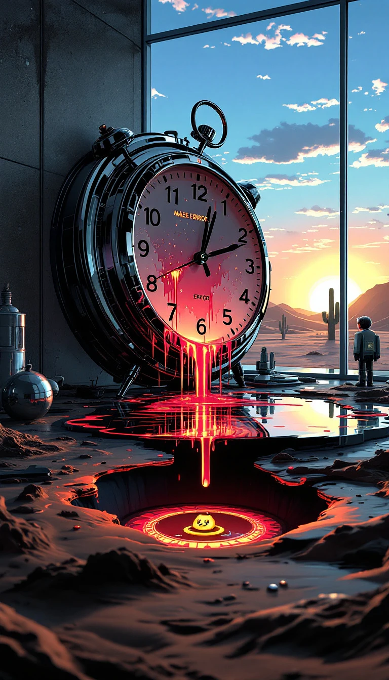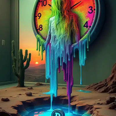 A sterile office with a melting Dali-style clock. A glitchy 8-bit avatar (neon hair) winks as a blank resume ("NAME: ERROR") morphs into a crypto NFT. The clock drips into a desert sunrise, revealing a tiny Dogecoin logo in the molten pool.