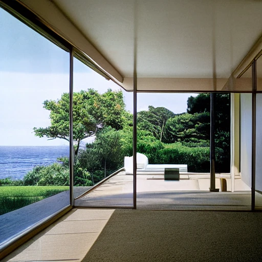 hyper realistic eye level exterior photo of a mid century modern style house overlooking the ocean, daylight, indirect lighting, AD magazine, Frank Lloyd, Eames, Mies van der Rohe