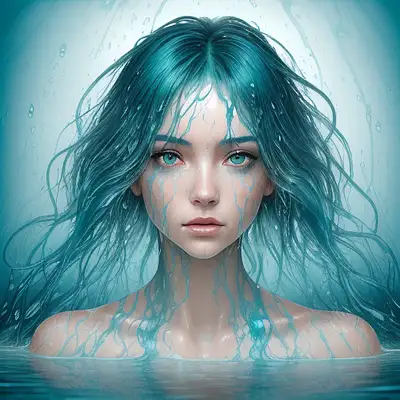 Masterpiece, Stunning, Best quality, a half body portrait of a woman as made of water, half body submerged in water, at a lake, turquoise hair depicting as waterfall, wet, drops of water on the face and body, natural body posture, rain, Art by Alberto Seveso, symmetrical, abstract artstyle, intricate complex watercolor painting, sharp eyes, digital painting, color explosion, concept art, volumetric lighting, Tanvir Tamim, metallic reflections, 8K, UHD, HDR, futuristic woman from the future with unreal sapphire eyes, fantastic white space flowers around her, lace black armor-dress, inpunk, 32k, hyper detailed face, cinematic light, hyper realism, hyper detailed, realism, photorealistic style, by Henri Cartier Bresson, Annie Leibovitz, Steve McCurry