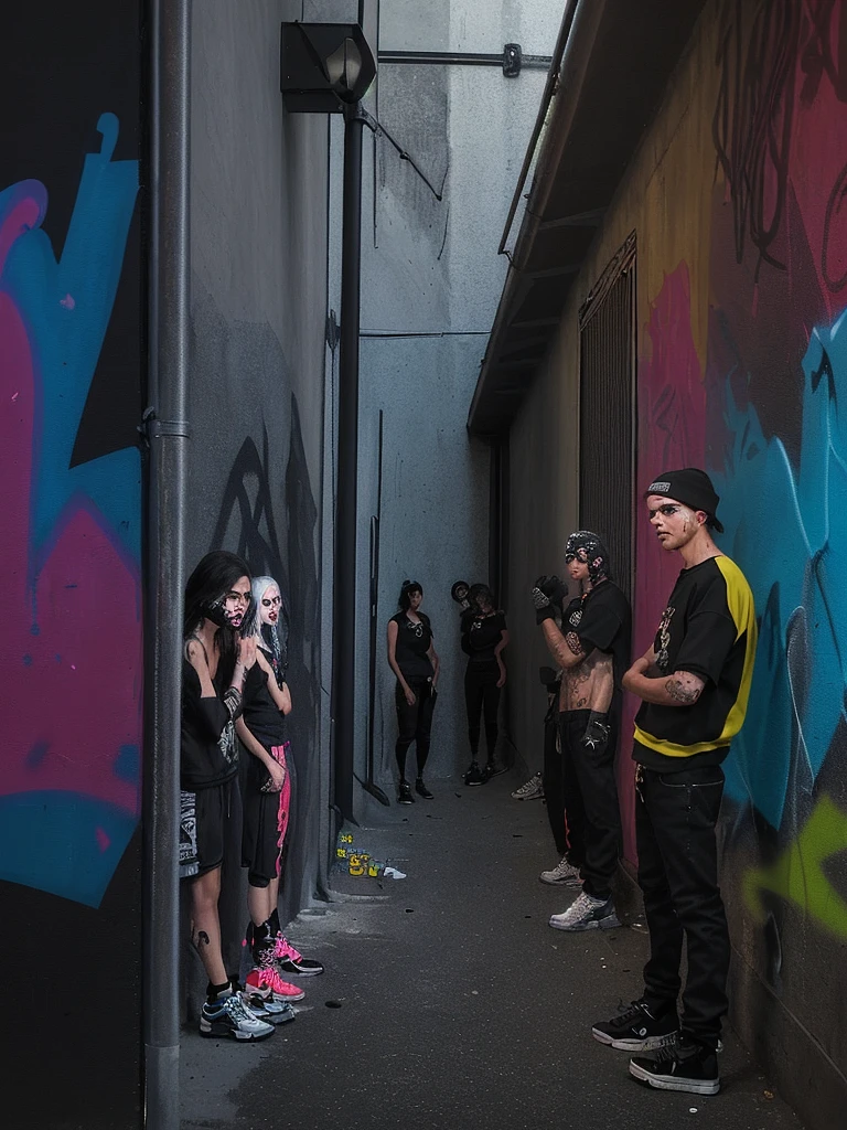 A rebellious street gang gathered under a flickering streetlight in a dark alley, their faces partially hidden by shadows, graffiti-covered walls surrounding them, showcasing their edgy and urban aesthetic. Painting, using acrylic paints on canvas, with a focus on bold lines and vibrant colors to bring out the energy of the scene, --ar 9:16 --v 5
