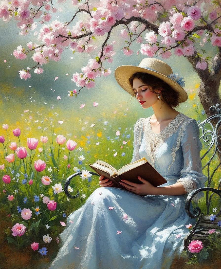 An impressionist painting of a solitary woman seated beneath a blossoming cherry tree in a quiet spring garden. She wears a light blue dress with lace details and a wide-brimmed hat, her gaze distant as she holds an open book on her lap, momentarily forgotten. Around her, nature flourishes — clusters of tulips, wild violets, and budding roses surround a wrought-iron bench. Petals drift gently in the breeze, some resting in her lap. The late morning light filters through delicate branches, casting soft, dancing shadows on her face and dress. The painting is rendered with airy, visible brushstrokes in a dreamy palette of pale pinks, lavender, cream, mint green, and sky blue. The atmosphere is introspective and poetic, capturing a fleeting moment of peace, solitude, and the gentle awakening of spring.