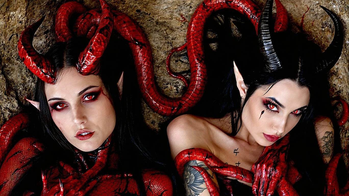 Photoshoot book cover, full body shot, bottom view, low angle of two young beautiful gorgeous supermodel women (Succubus) with horns, covered in red snake pattern skin, crimson colored eyes, long black hairs, glam siren eyes, wearing tattoo. They lean forward and look at the viewer, their facial expressions are indifferent, their postures are relaxed and curved, in a slimy and disgusting cave background , Luis Royo style, dark mischievous fantasy, dungeons and dragons --no elven ears